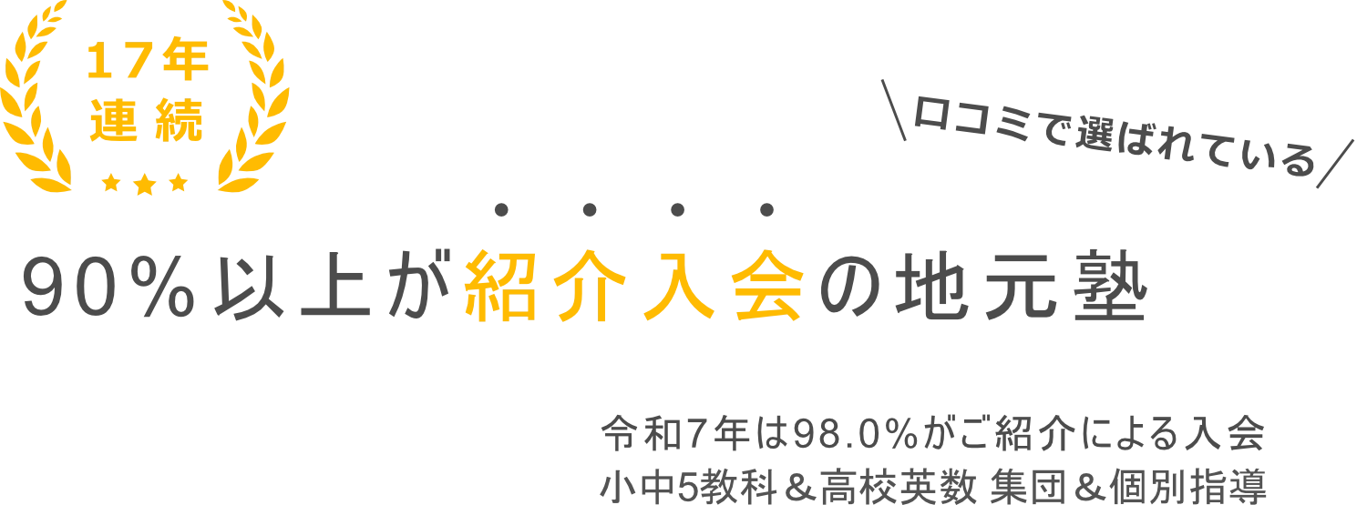 - その結果、ロコミで選んでいただいて、毎年新入会の90%以上が生徒からのご紹介での入会。