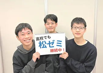 僕は、中学1年生から松ゼミにお世話になりました。中学2年生まで個別で、中学3年生から集団で教えていただきました。松ゼミの先生方はとてもフレンドリーで毎回授業が楽しかったです。過去問を通した自分の苦手分野や難しい問題等を細かく解説してくれたおかげで学校のテストでも安定して点数をとれるようになりました。松ゼミという場所があったからこそ僕は最後の最後まで諦めずに前に進むことができ、入試本番も自信を持って取り組み合格することができました。3年間手厚いサポートをしてくれた先生方には感謝の気持ちでいっぱいです。本当にありがとうございました。