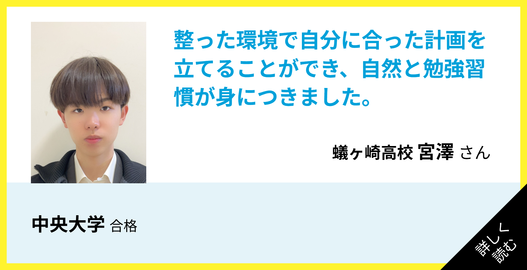 僕は高校3年生の夏に松ゼミに入りました。それまではほとんど勉強が進んでおらず、志望校に合格するのは厳しい状態でした。しかし、計画を立ててその通りに勉強を進めるのが苦手という僕の欠点を松ゼミで補うことで合格することができました。ありがとうございました。
