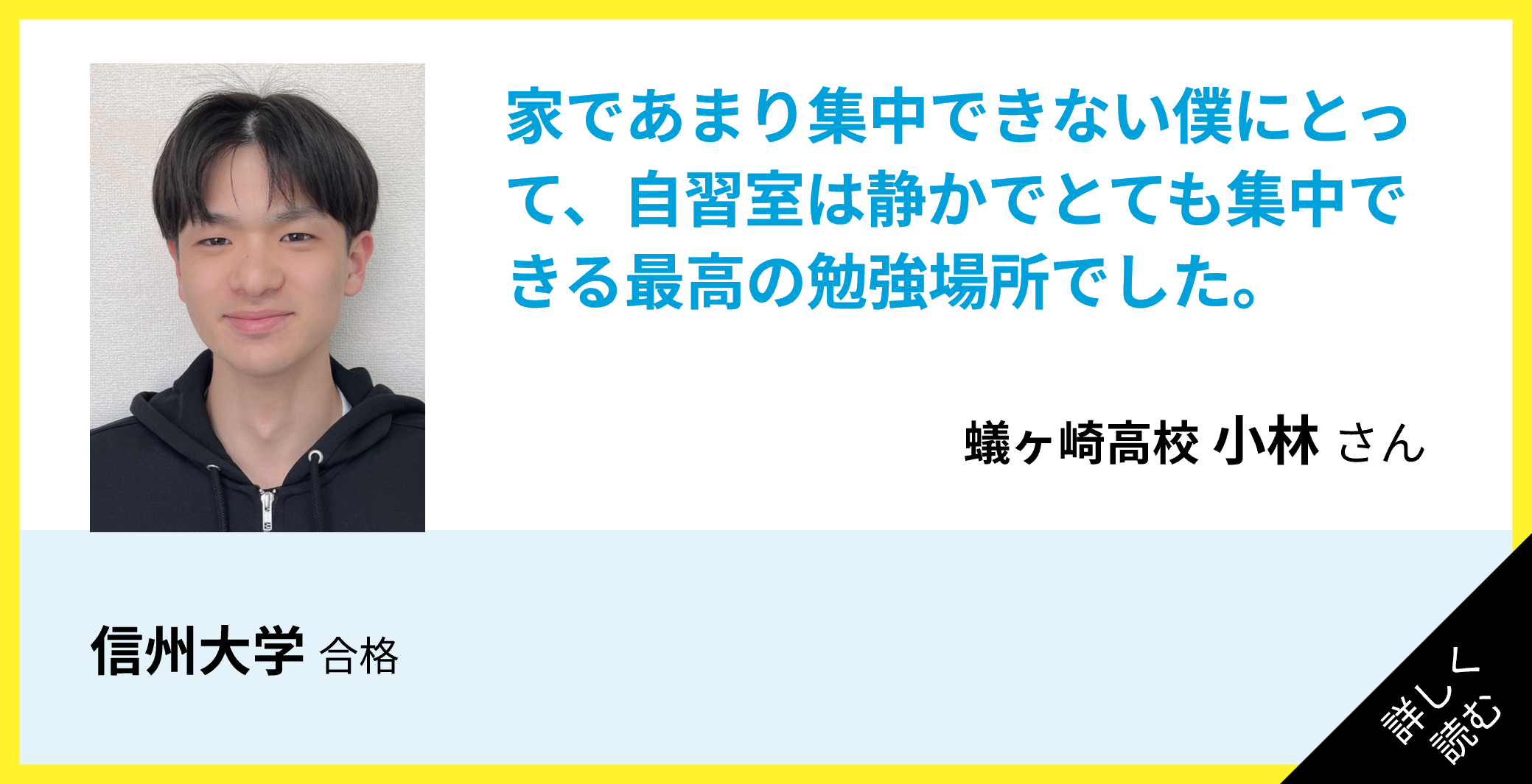 僕は3年の夏ぐらいからこの塾に入りました。家では勉強に全然集中できなかったけど、机は仕切りで囲まれていて視界に余計なものが入ってこないし、とても静かなので勉強にだけ集中できてとてもよかったです。授業では細かく勉強の計画を立ててもらえて、自分が今何をやったらいいのかを明確に教えてもらえるので、とても効率的に勉強を進めることができました。本当にありがとうございました。